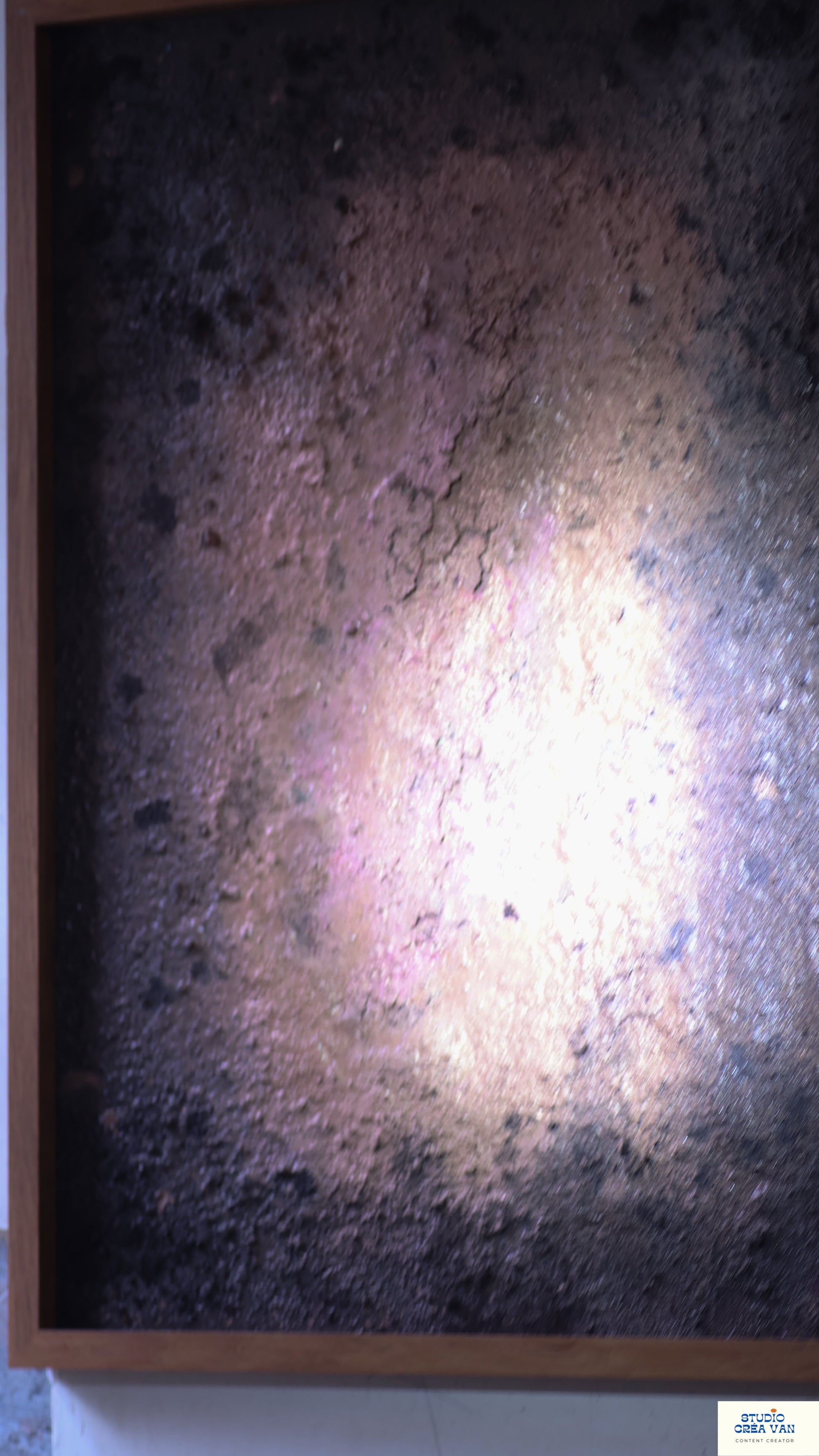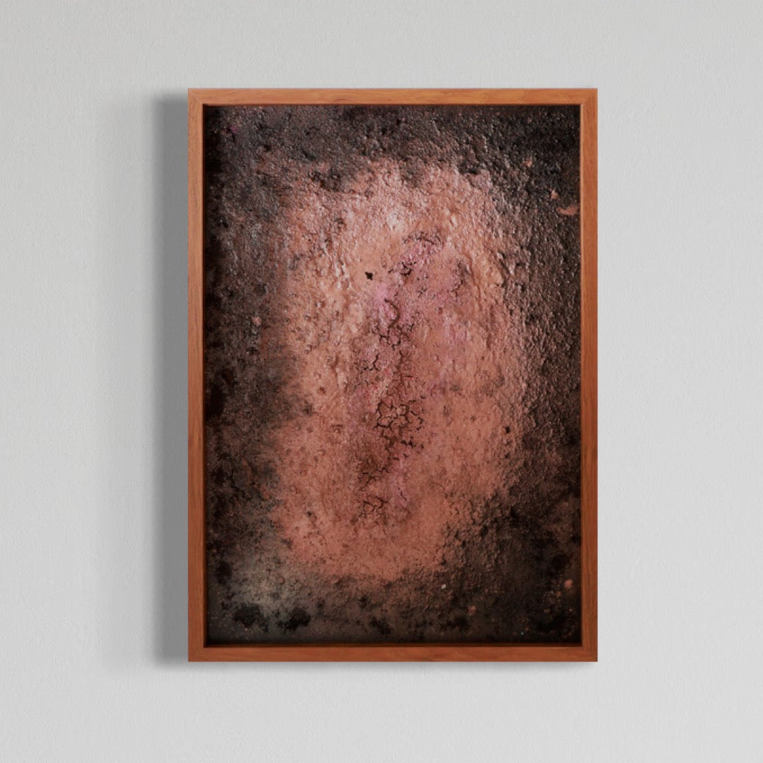 Ses textures craquelées et ses teintes rosées-minérales créent l’impression d’un sol ancien qui se fissure pour laisser émerger une nouvelle lumière.